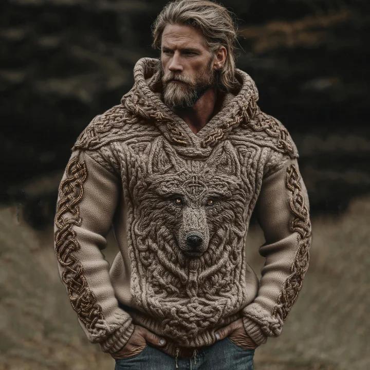Men's Viking Wolf Celtic Knot Jacquard Knitted Hooded Sweater