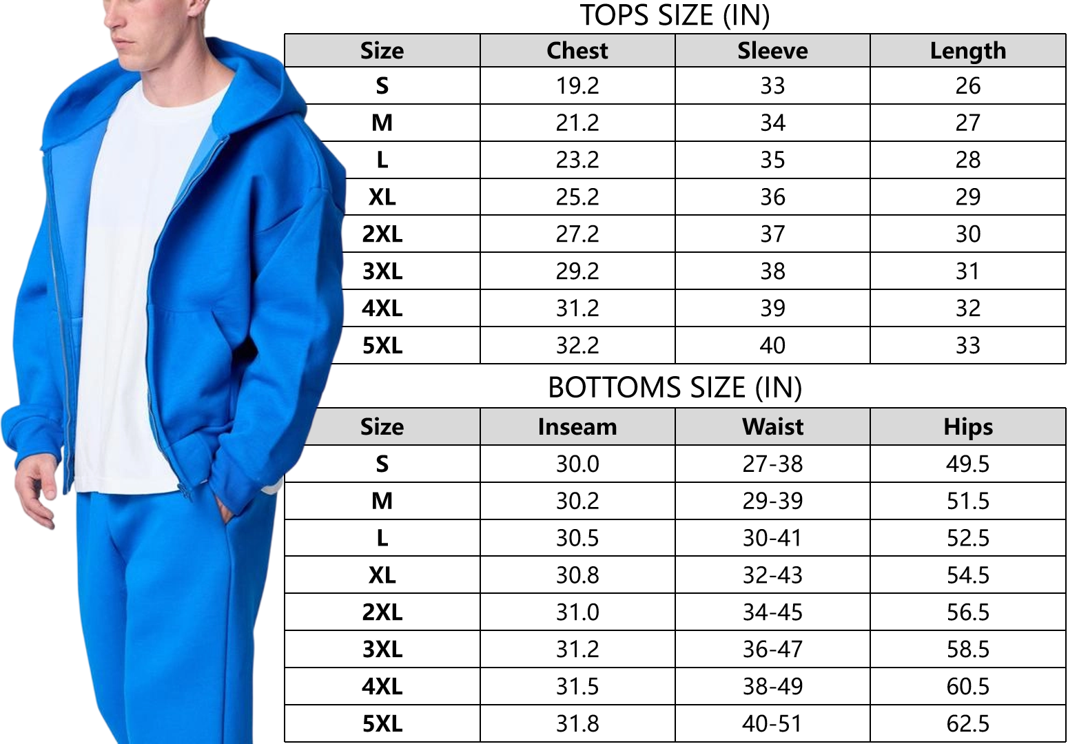 Covers sizes from S to 5XL, fitting diverse body types. The relaxed silhouette of the set ensures a comfortable, unrestrictive fit for most users during leisure wear.