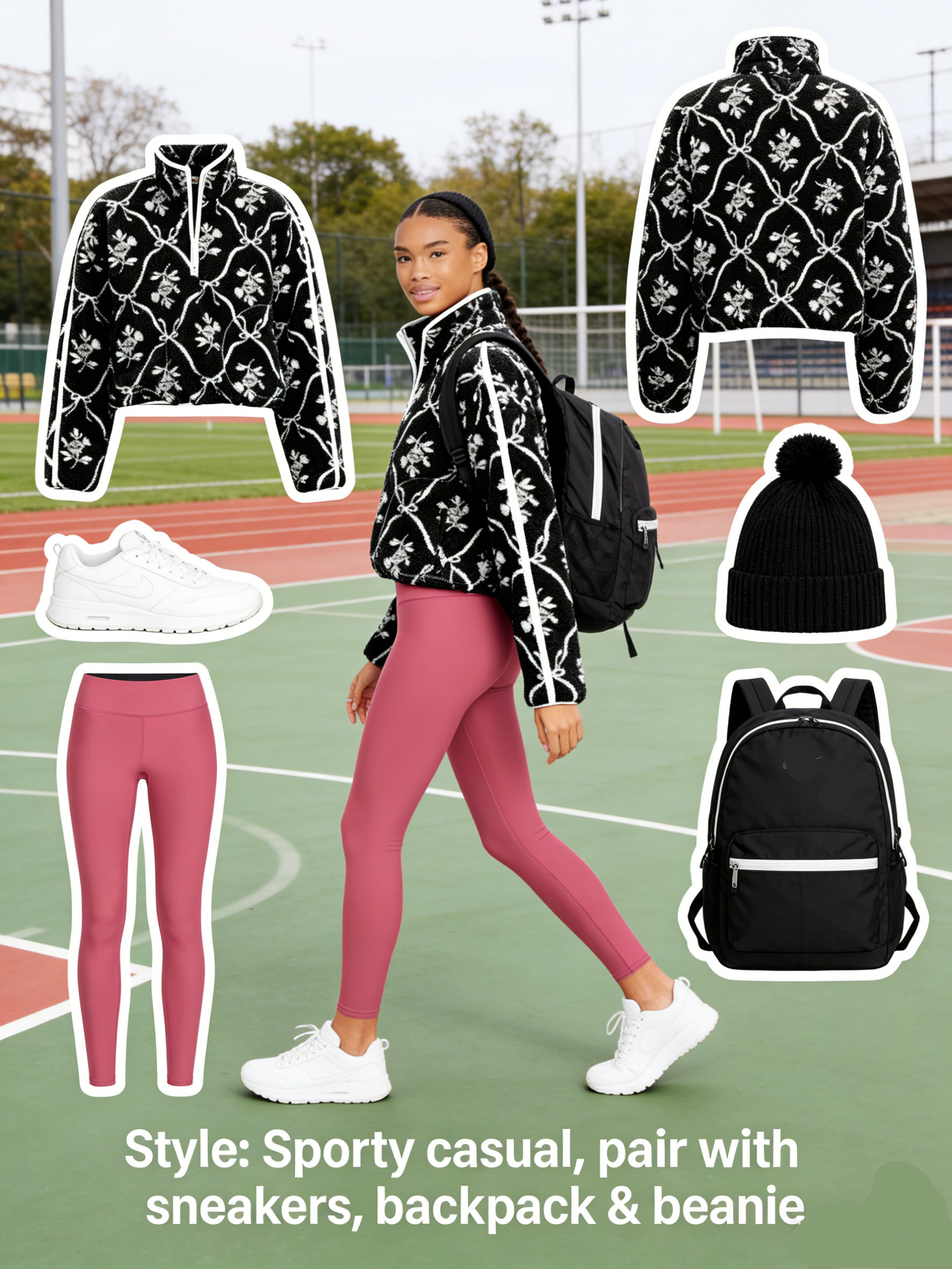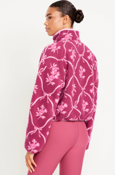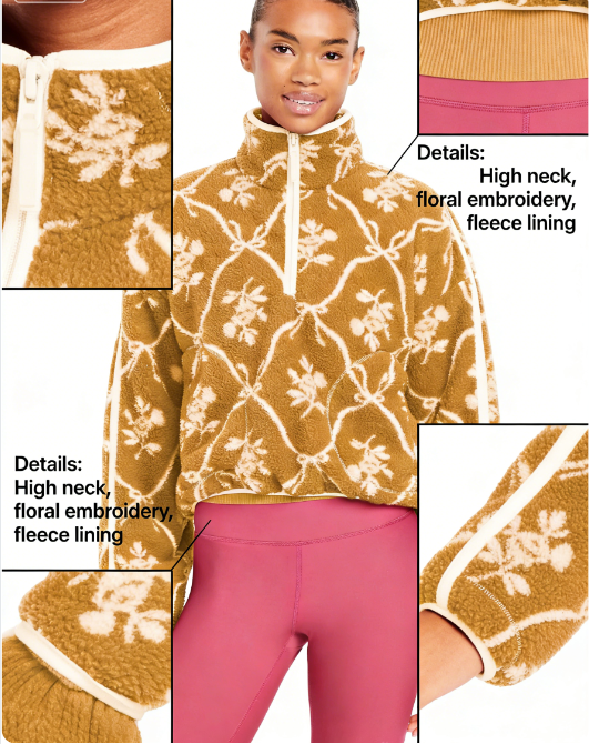 It features a cropped oversized fit with a relaxed, slouchy shape. The short length (hitting above the waist) pairs seamlessly with high-waisted bottoms, while dropped shoulders and loose sleeves amplify the casual, effortless vibe. The half-zip mock neck adds structure without feeling restrictive.