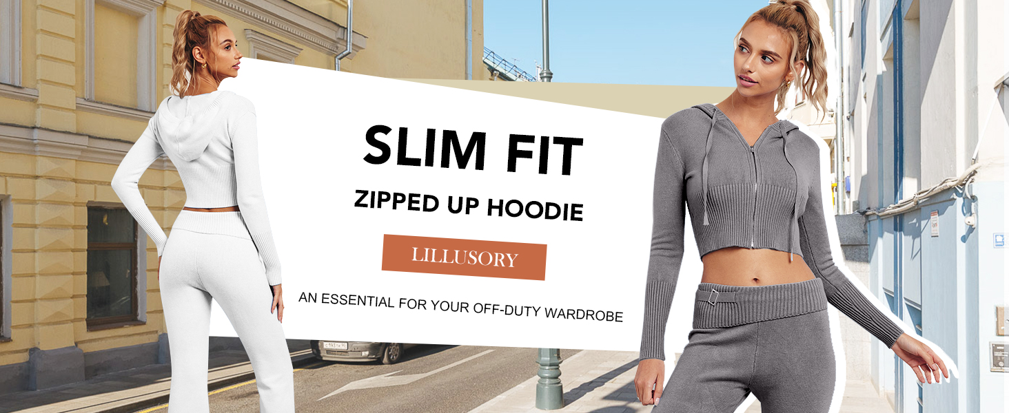The hoodie is ribbed on the cuffs and waist, hooded with adjustable drawstrings and also features an zipped up front. The bottom is designed with a ribbed rollover waist, and a buckle accent.