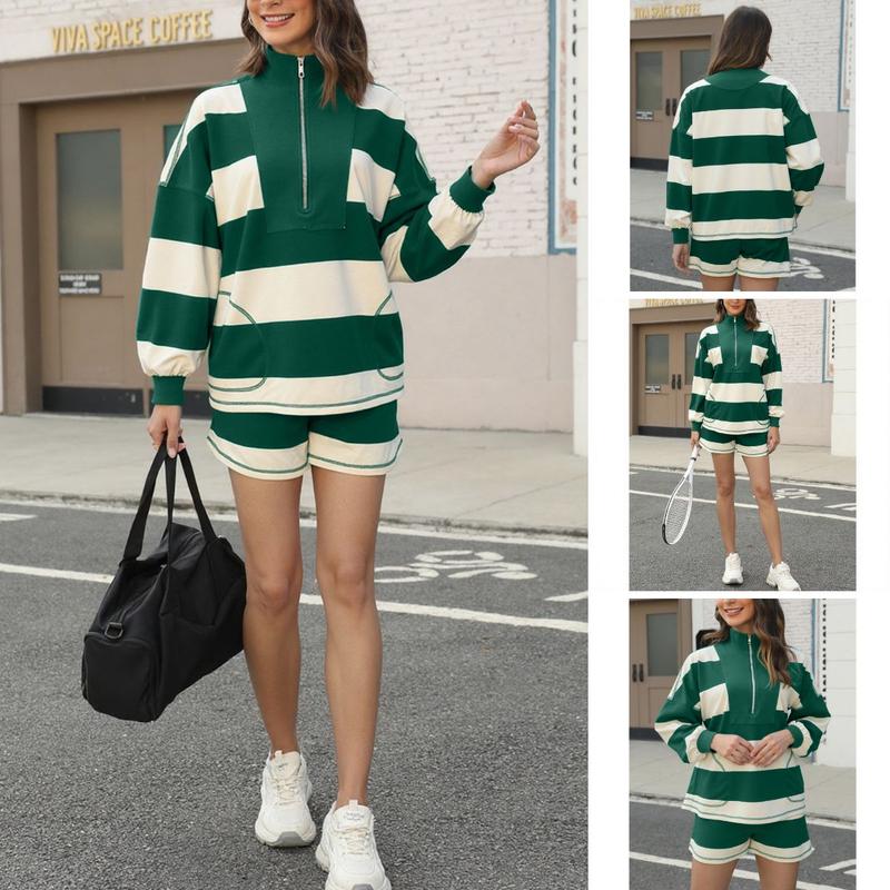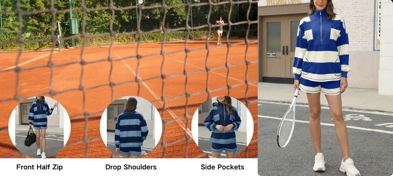 Features: Stand out in bold wide stripes! The top has a front half-zip, drop shoulders and side pockets; the matching shorts have an elastic waist.