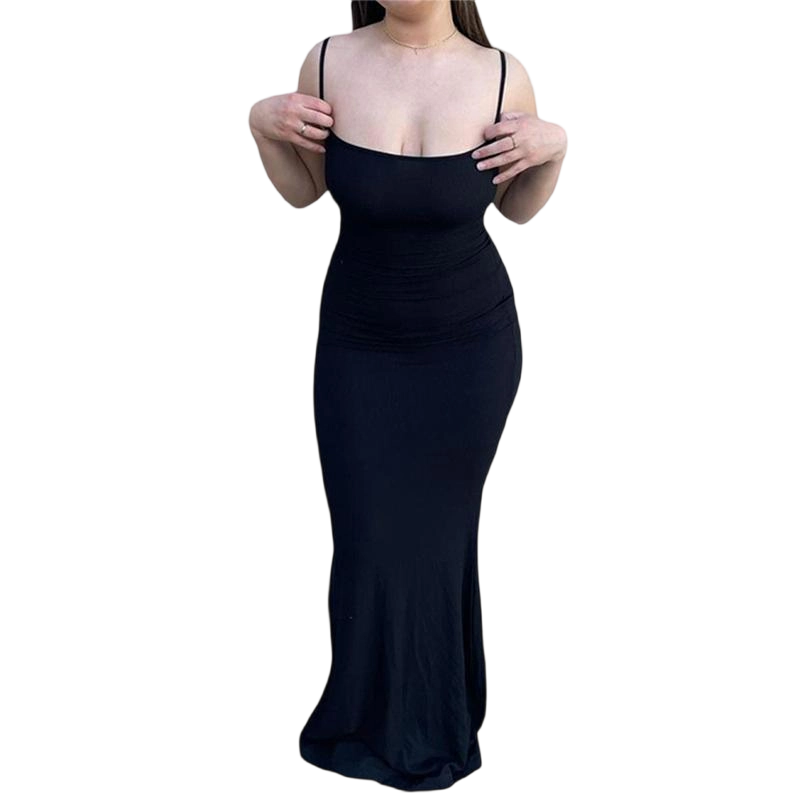 Bodycon maxi style, cami long tight dress, spaghetti strap, low cut, sexy backless, solid color, floor-length, basic elegant formal dress, fishtail hemline design, flares out at the bottom gives a mermaid look and hourglass body. Not too tight to walk and so cozy to wear all days.