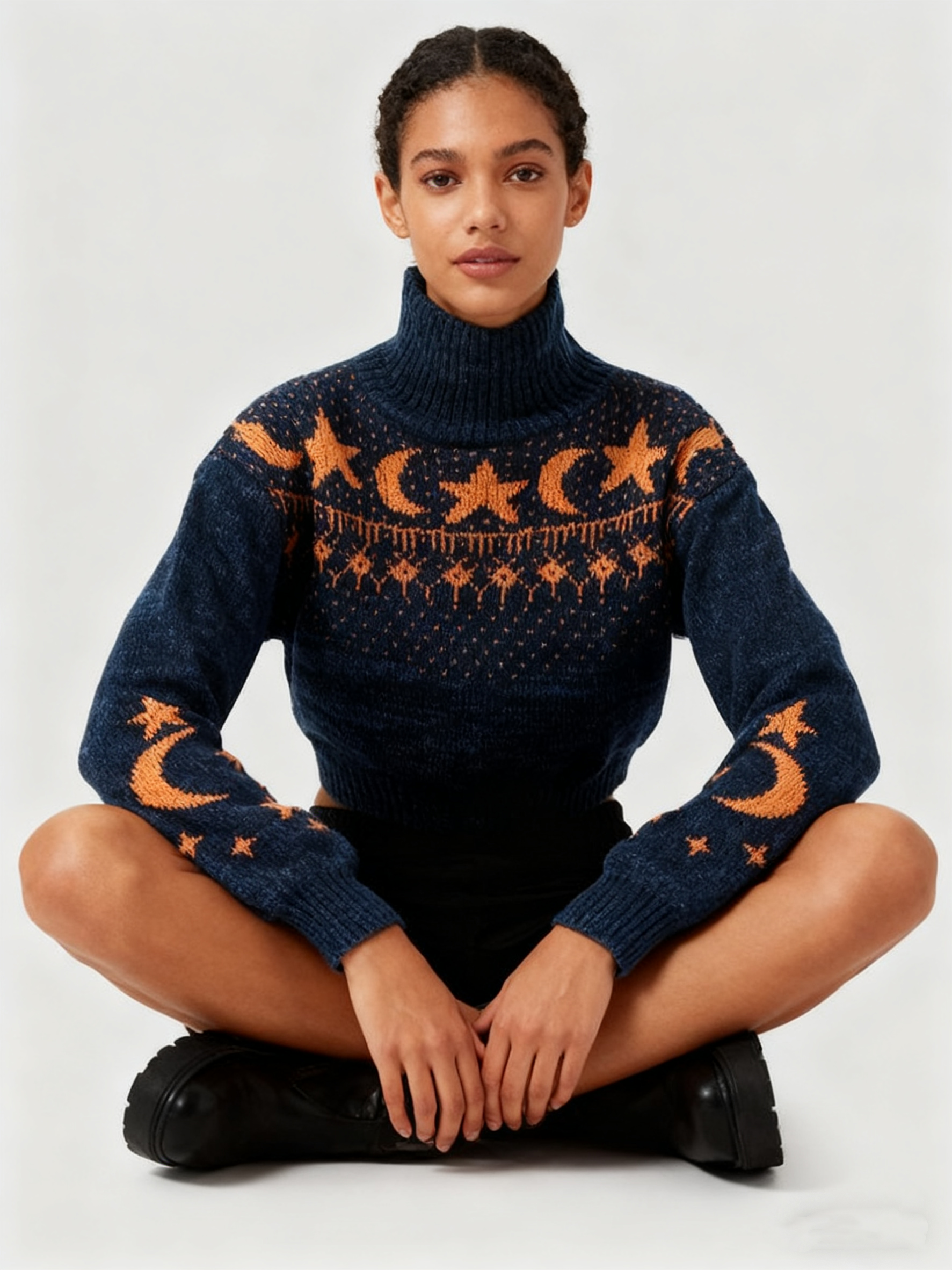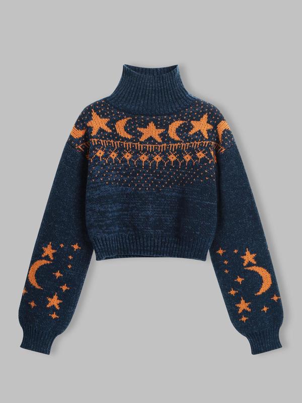 Features: Women's cardigan: moon/star print, V-neck, button-down, long-sleeve, drop shoulder, cropped, soft & cozy.
