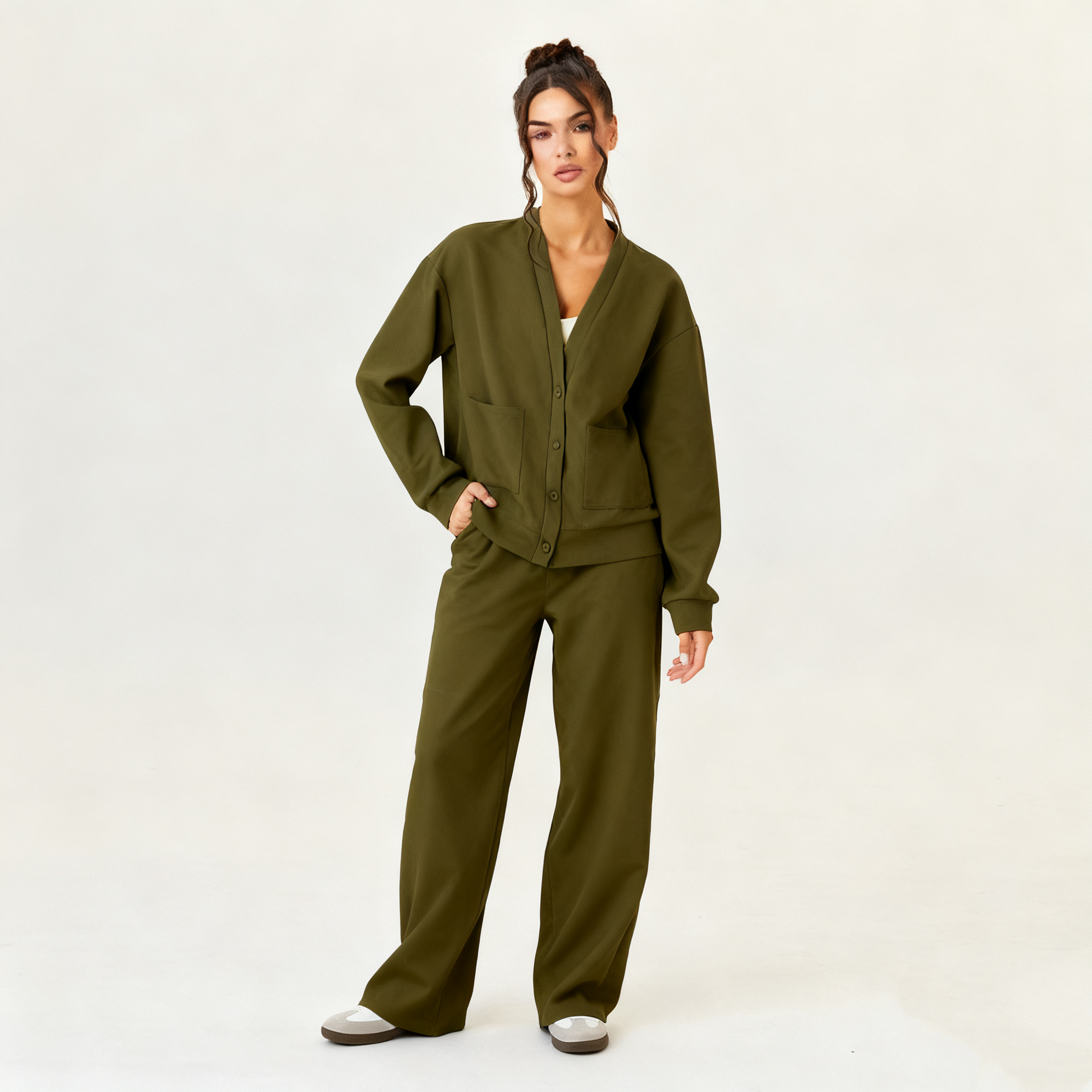 Details Display: The v-neck, Long sleeves, Side pockets, Drawstring waist, Stretch, Soft and breathable fabric.