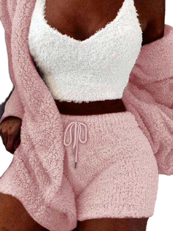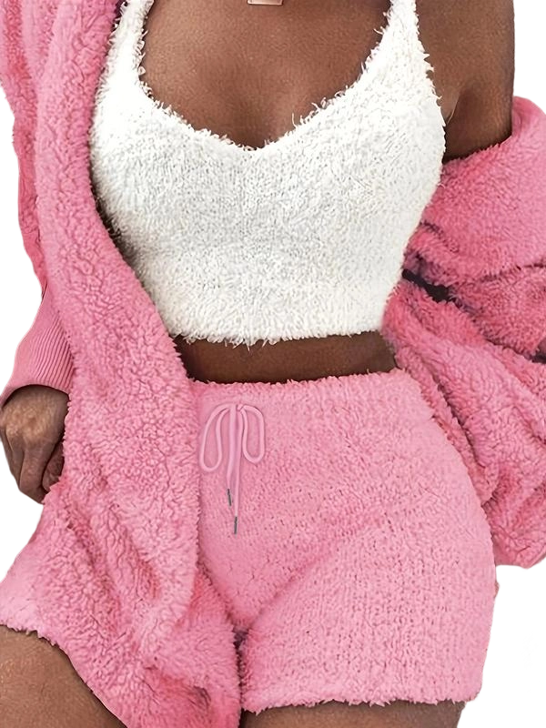 【Three-piece Set】: This pyjama ensemble includes a hooded coat, cropped cami top, and tie front shorts for a complete loungewear experience.
