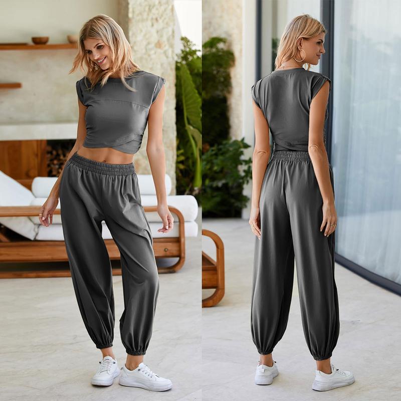 - 95% cotton, 5% spandex Women's sports two-piece set, lightweight fabric, soft and gentle on the skinThe top features a unique cross design at the waist, visually enhancing a slender waistline; the bottoms are loose and comfortable, visually increasing the waist-to-hip ratio.