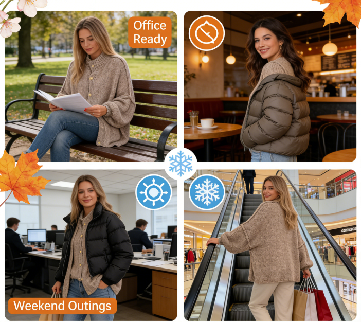 Suitable for various occasions: Weekend leisure (paired with jeans), work commutes (layered with a shirt), coffee dates (paired with a dress), and even light outdoor excursions—combining comfort and style, suitable for both relaxed and semi-formal settings.Styling suggestions: Pair with black leggings and ankle boots for a simple and casual look.Layer a white T-shirt with high-waisted jeans for a relaxed weekend outfit.Pair with a slip dress and heels for a soft, feminine date look.